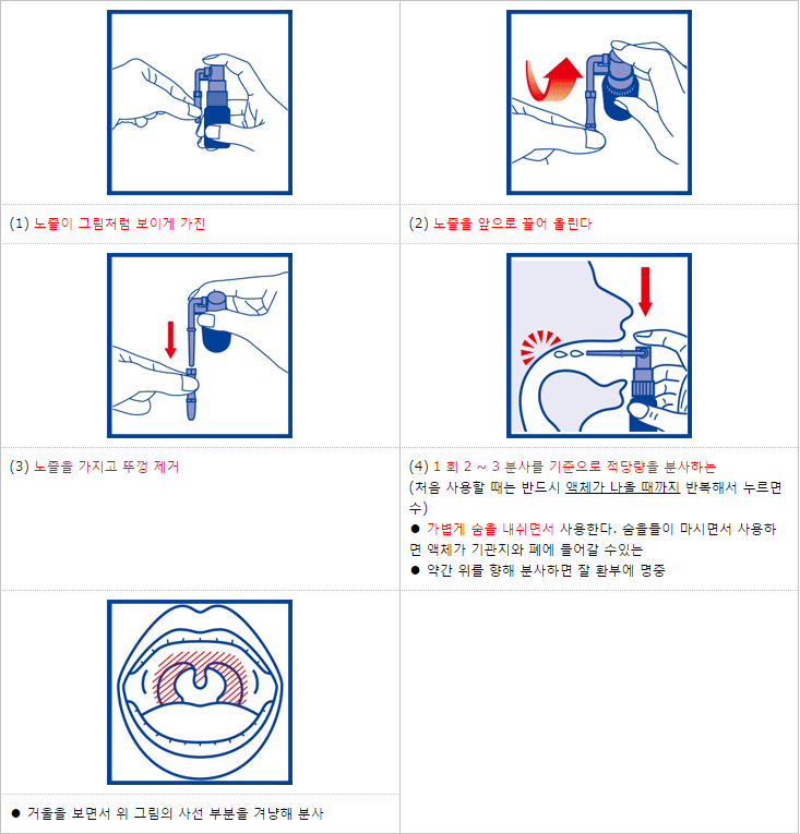 (1) 노즐을 목의 환부로 향해서, 가볍게 숨을 내뿜으면서 분사(숨을 들이마시면서 사용하면, 액이 기관지나 폐에 들어갈 수 있다)